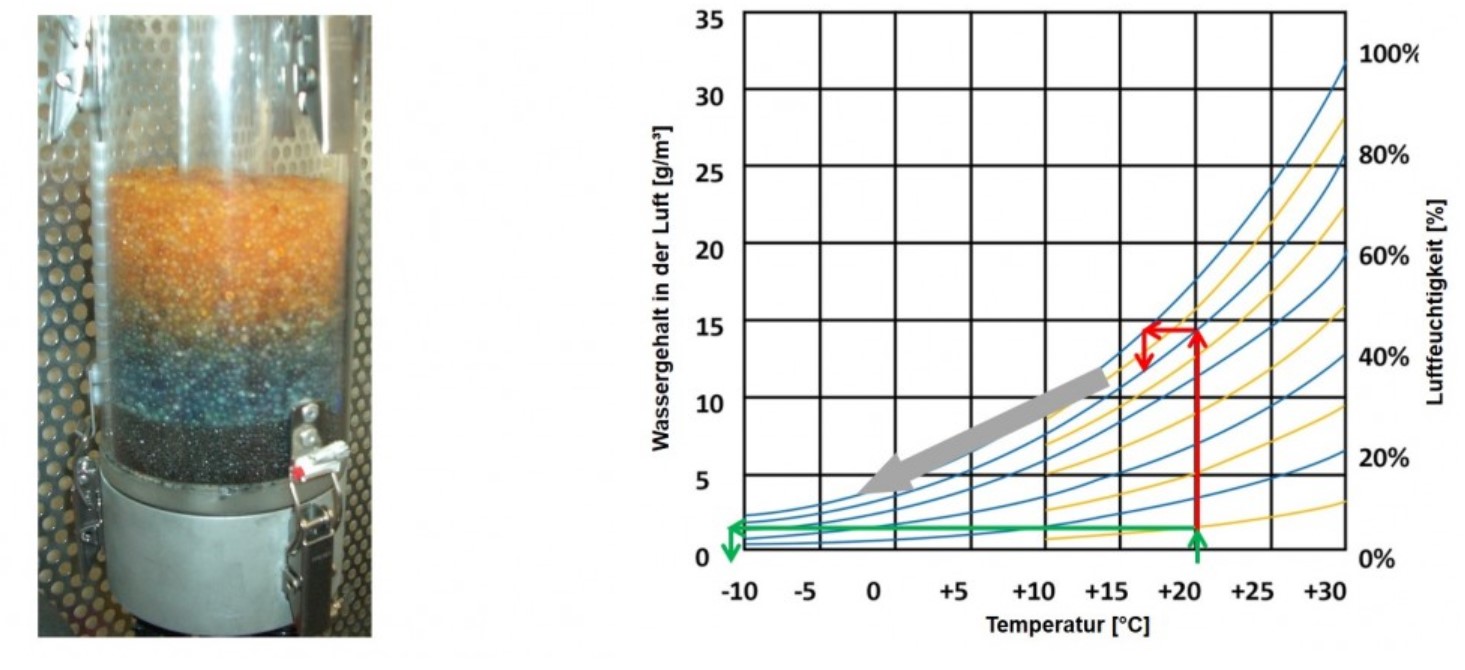 | Adsorber senkt die Luftfeuchte zu Beginn auf unter 2%rF und den Taupunkt auf unter -40°C |
