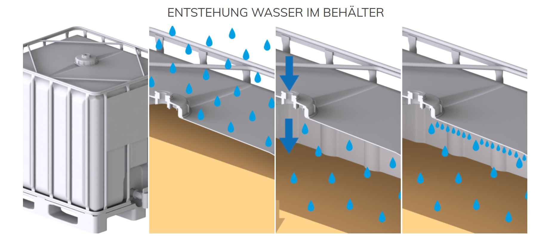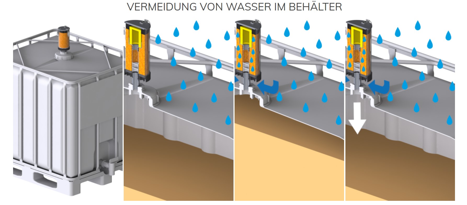 -> Feuchtigkeit verbleibt im Trockenmittel -> Kein Wasser im Behälter -> Kein Qualitätsverlust der Substanz |