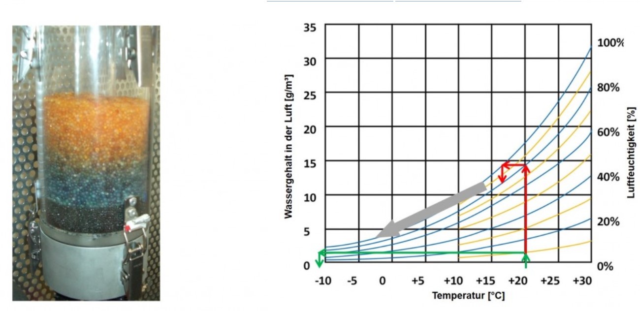 Wir liefern sämtliche Adsorber neu mit GIEBEL Xdry® aus. Die neue Schüttung macht unsere Belüftungstrockner noch effektiver, denn Sie vereint die Stärken von Molekularsieb und Silicagel Orange-Grün. Während Molekularsieb die deutlich stärkere Bindungsenergie zu polaren Stoffen, insbesondere zu Wasser, besitzt, punktet Silicagel Orange mit seiner sehr hohen Wasseraufnahmekapazität. Der Trocknungsverlauf von GIEBEL Xdry® zeigt, dass die Mixtur zu Beginn die Restfeuchte der ausströmenden Luft wie Molekularsieb sehr niedrig hält und sich mit zunehmender Beladung der Verlaufskurve von Silicagel angleicht. Damit wird durch einen mit GIEBEL Xdry® gefüllten Adsorber bis zu seinem Farbumschlag nach Grün ein höherer Anteil an Feuchtigkeit gebunden und Ihre Anlage bleibt noch besser geschützt. |