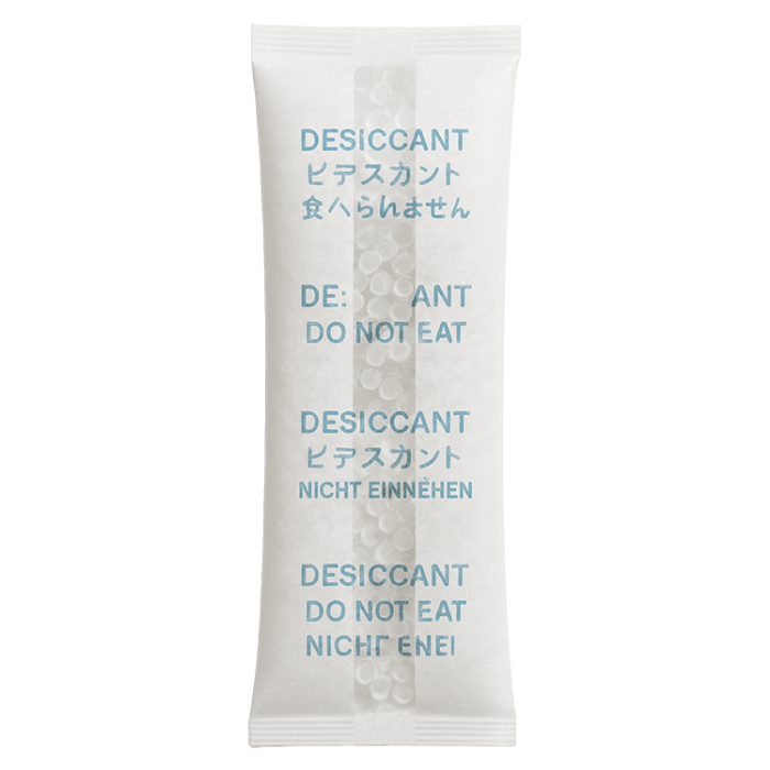 Es gibt auf dem Markt Trockenmittelbeutel, die einen blauen Aufdruck haben. Dieser dient als indikative Information zur umgebenden Luftfeuchtigkeit, sagt aber eigentlich nichts über die wirkliche Restaktivität des darin enthaltenen Trockenmittels aus. Daher verzichten wir auf solche Angebote.