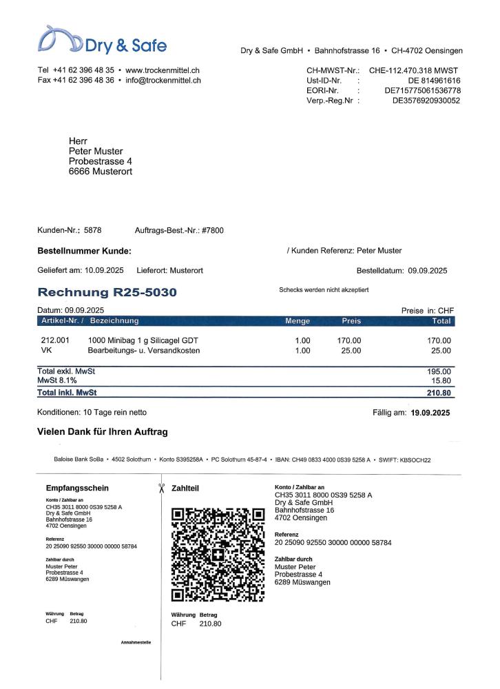 Wir liefern in der Regel gegen Rechnung, zahlbar rein netto ohne Abzug innert 10 oder 30 Tagen nach Erhalt der Ware. Bei Erstbestellern behalten wir uns Lieferung gegen Vorauszahlung vor. Als Sicherheitsmassnahme gewähren wir die Zahloption Rechnung nur nach erfolgter Bonitätsprüfung.
